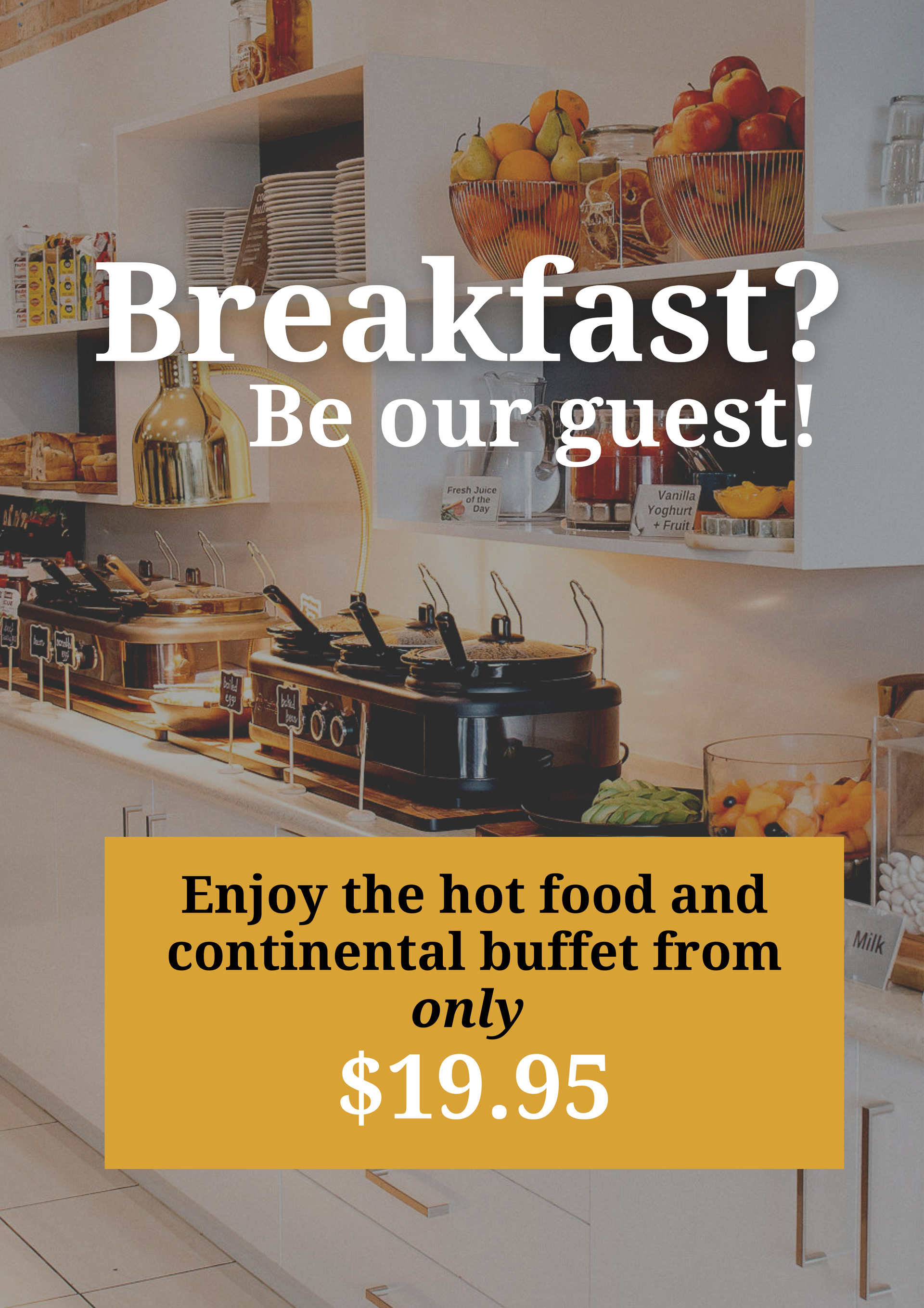 Our onsite breakfast restaurant is open every morning with an extensive buffet spread including freshly ground coffee, freshly squeezed juice and a wide range of continental style and hot cooked food.