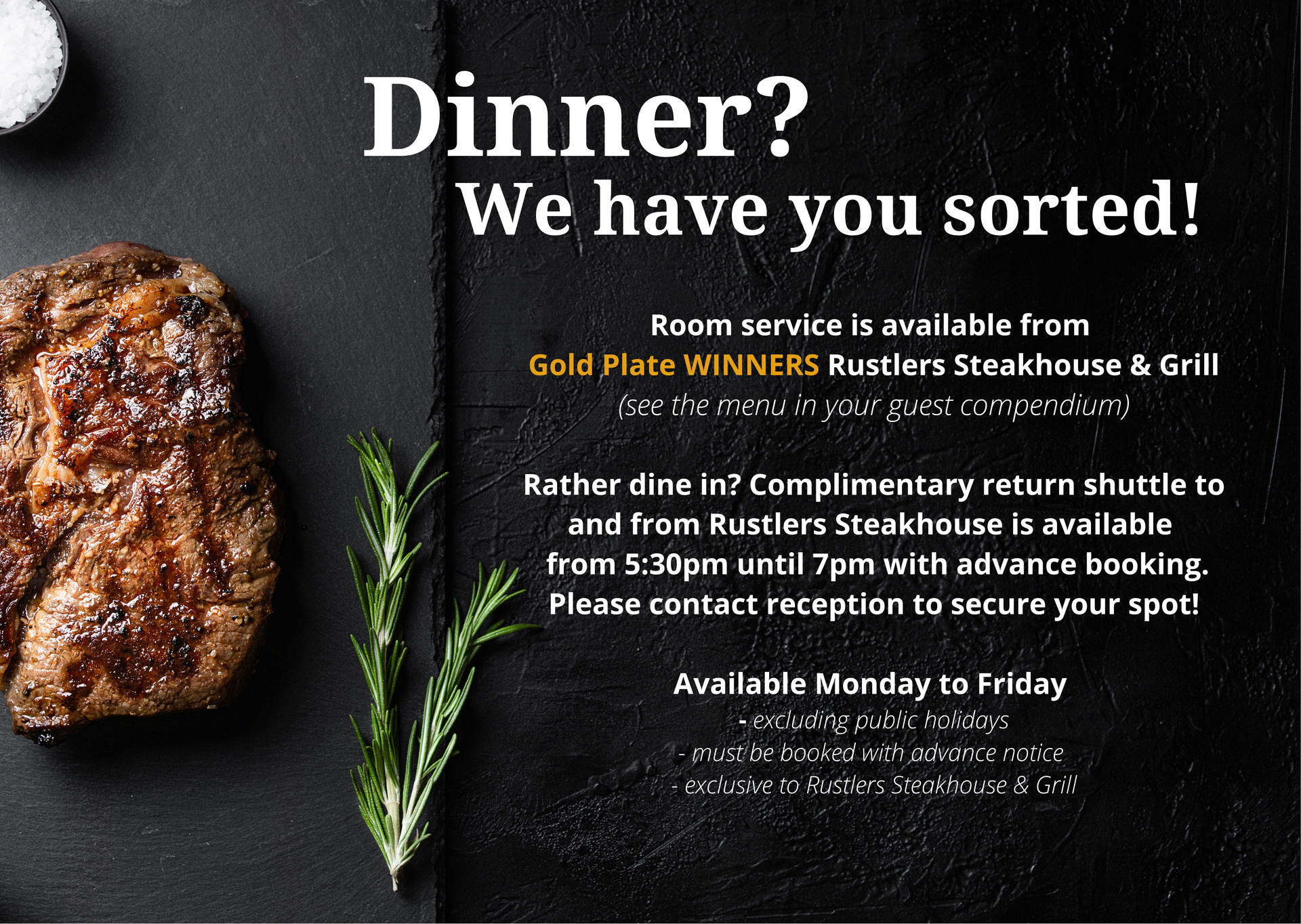 We also offer complimentary shuttle and dinner room delivery from our award winning partner restaurant, Rustler's Steakhouse & Grill over selected evenings.